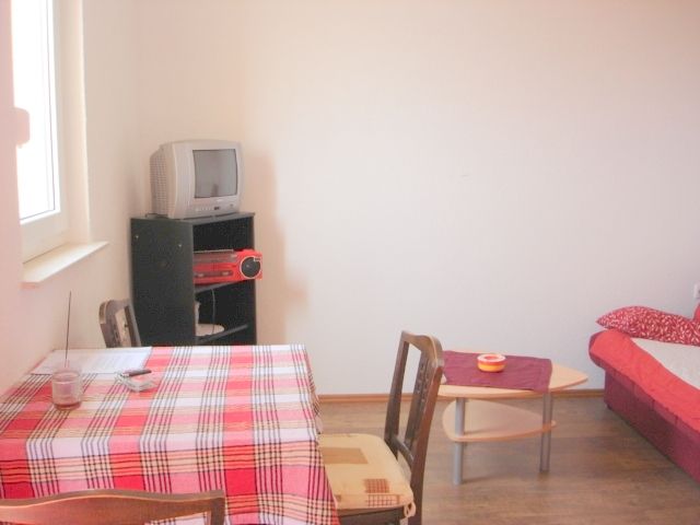 Descrizione:tavolo e sedie per tutti gli occupanti; stoviglie, posate, pentole e bicchieri, sufficenti per il numero delle persone nell'alloggio, frigorifero, congelatore 10 l, macchinetta da caffe; tostapane,  Studio (area per soggiornare, cucinare e prenottare in un unico spazio: letto matrimoniale, un divano letto per due persone; Bagno:bagno con wc, con docciaCaratteristiche dell unita abitativa:Sat/TV; Bagno con doccia lavatrice presso il locatore, ogni lavaggio costa: 5,00 Euro.E dotato di tavolo e sedie. La biancheria da letto viene cambiata ad intervalli settimanali, asciugamani 1 grande, 1 piccolo per persona/settimana.- Persone al massimo: 4